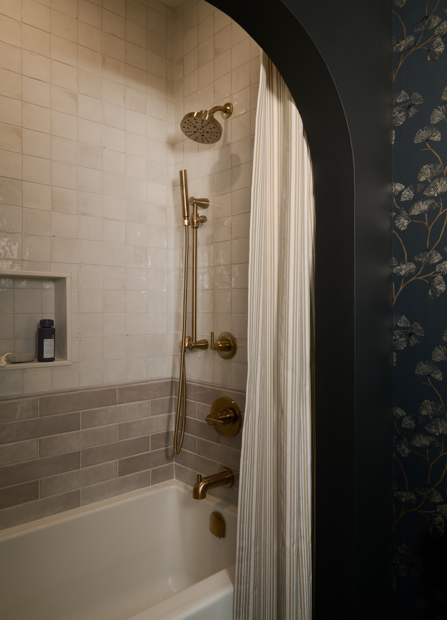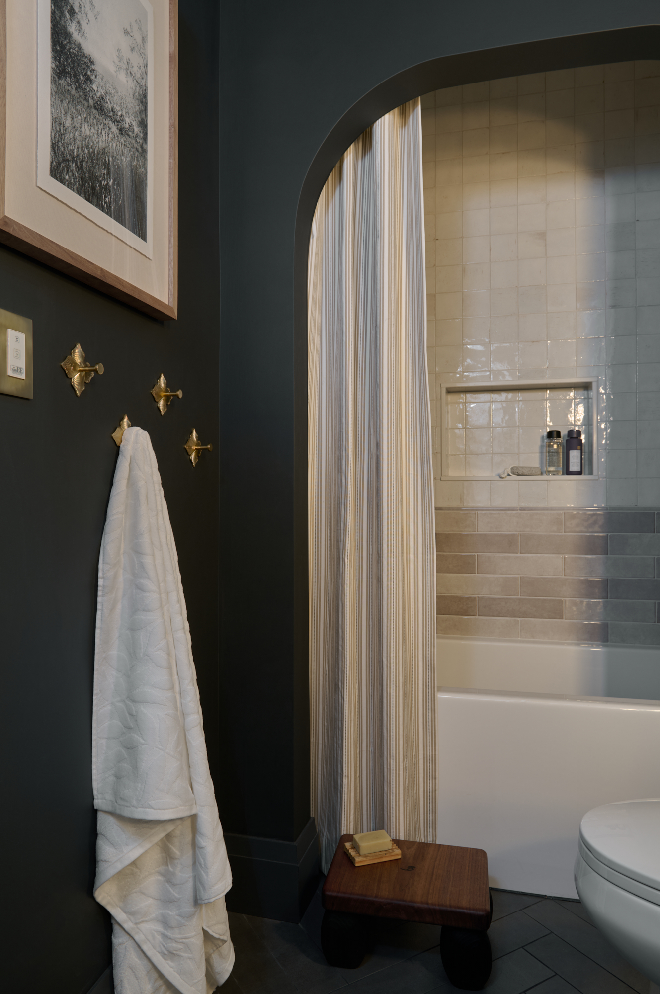 Stunning and bold ensuite with gold accents.